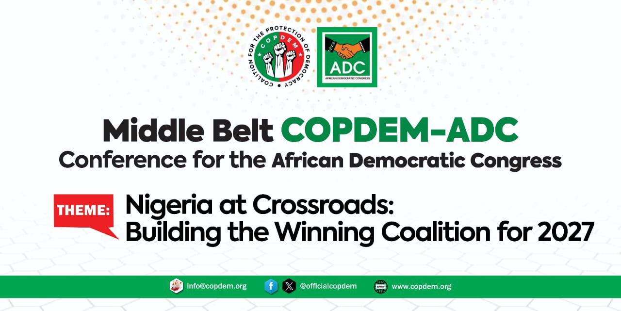 The Middle-Belt Chapter of the Coalition for the Protection of Democracy (COPDEM), in strategic alliance with the African Democratic Congress (ADC), is set to host a landmark political conference titled “Nigeria at Crossroads: Building the Winning Coalition for 2027”. The conference will take place in Jos, Plateau State, Nigeria, commencing at 12:00pm.