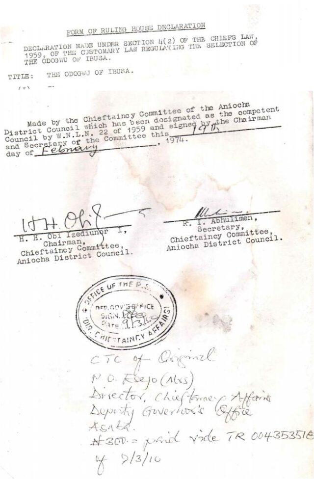 6. The conferment of Odogwu Ibusa title is guided by the provisions of Midwest State Government Declaration on the selection, appointment and conferment of the title of Odogwu of Ibusa applicable to Delta State, made under Section 4(2) of the Chiefs Law, 1959 of Western Region of Nigeria. A certified true copy of the Declaration is hereby attached.