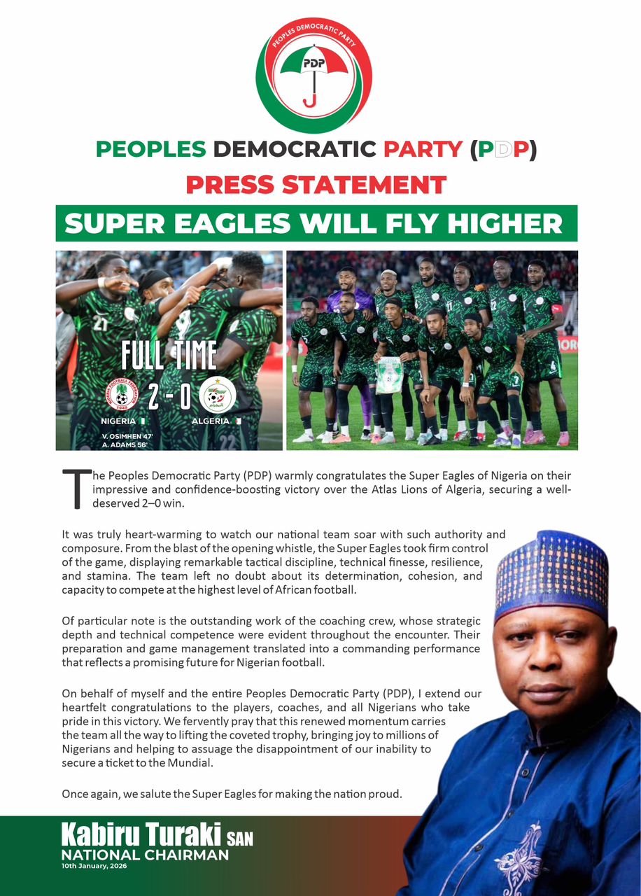 The Peoples Democratic Party (PDP) warmly congratulates the Super Eagles of Nigeria on their impressive and confidence-boosting victory over the Atlas Lions of Algeria, securing a well-deserved 2–0 win.