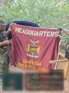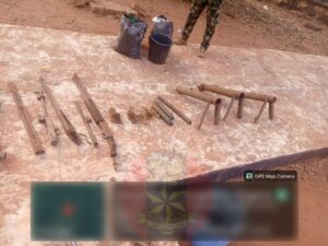 During the operation, multiple insurgent encampments were located, thoroughly searched, and neutralized. Items recovered include pump-action guns, locally fabricated dane guns, rifle magazines, assorted rifle parts, ammunition belts, and cutting equipment. Additional recoveries included Biafran currencies, materials for improvised explosive devices (IEDs), musical instruments from the Biafran Army Band, a Biafran flag, and a Biafran Army Headquarters flag. The flags were destroyed, and the Nigerian flag was raised in their place.